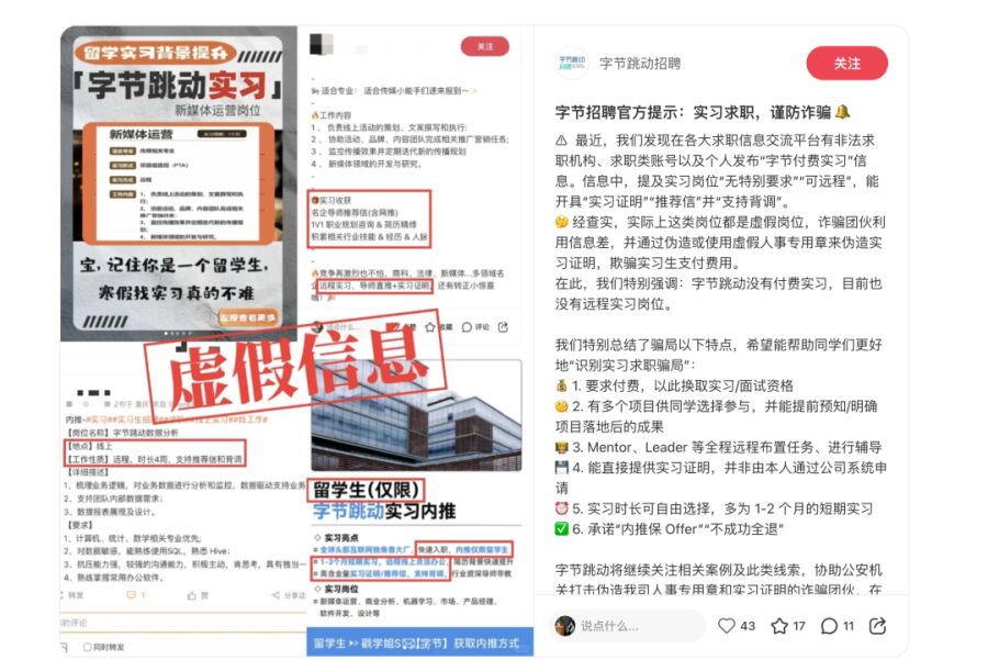蓝鲸记者了解到,早在去年10月字节就发布过类似的骗局警示。字节跳动招聘官方账号显示,各大求职信息交流平台有非法求职机构、求职类账号以及个人发布“字节付费实习”信息。信息中,提及实习岗位“无特别要求”“可远程”,能开具“实习证明”“推荐信”并“支持背调”。