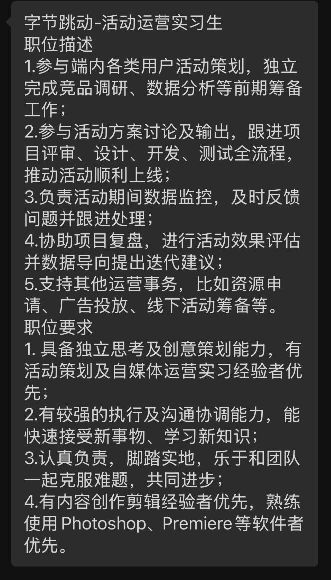 说罢,对方便发来一条字节跳动的岗位介绍,工作内容包括活动策划、数据监控、项目复盘等。