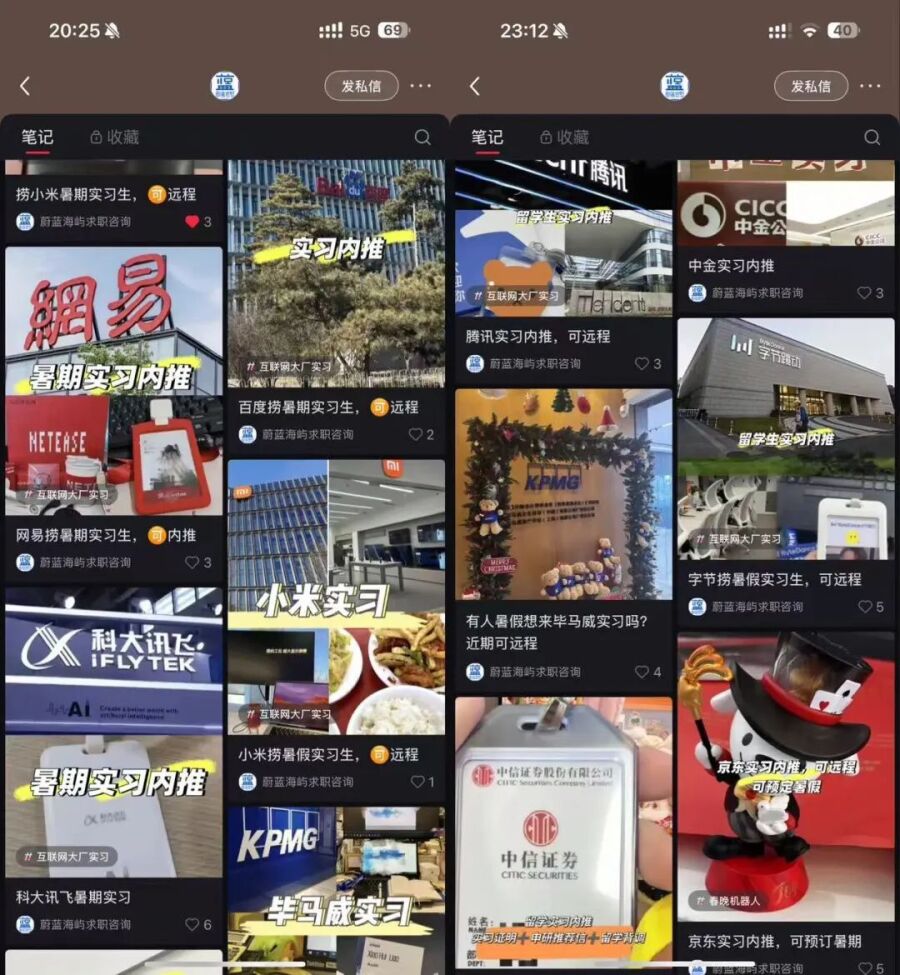 社交媒体上,多个付费实习中介正在持续发布引流推文。某中介账号主页显示,提供的实习机会涵盖互联网、金融、咨询等多个领域,从字节跳动、华为、小米、京东、百度等大厂,到德勤、毕马威,再到“三中一华”(中金、中信、中信建投、华泰联合),合作企业名单令人眼花缭乱。