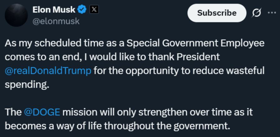 当地时间5月28日,美国政府效率部负责人埃隆·马斯克在其社交媒体平台X上发文表示,他即将离开特朗普政府,不再继续担任特别政府雇员一职。此外,马斯克在文中向美国总统特朗普致谢,并表示政府效率部(DOGE)团队将继续在整个政府范围内开展工作。