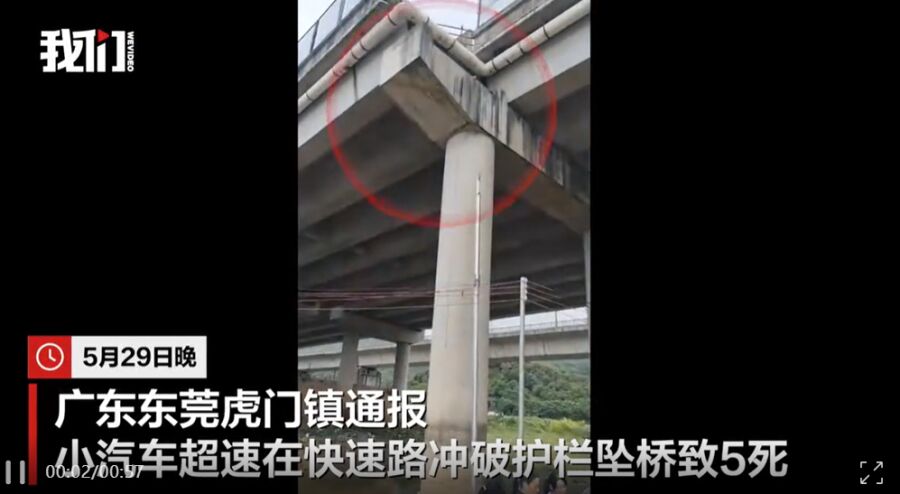 5月29日晚,广东东莞虎门镇通报,小汽车超速在快速路冲破护栏坠桥致5死。