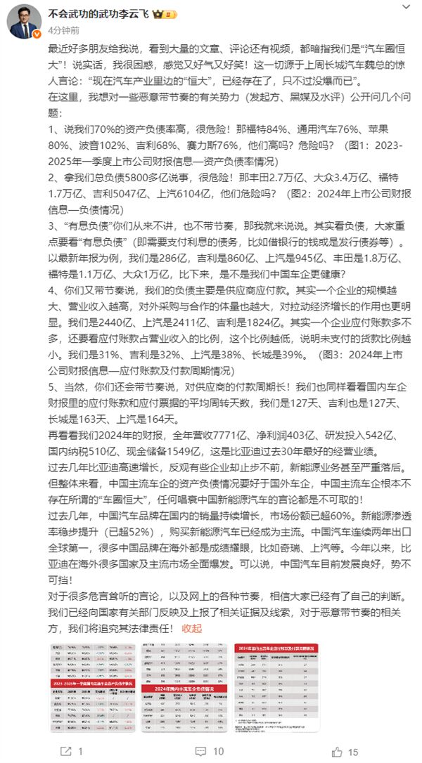 快科技5月30日消息,刚刚,比亚迪集团品牌及公关处总经理李云飞就网传“汽车圈恒大”一事进行了长文回应,其表示称: