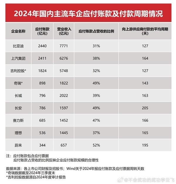 我们是2440亿、上汽是2411亿、吉利是1824亿。其实一个企业应付账款多不多,还要看应付账款占营业收入的比例,这个比例越低,说明未支付的货款比例越小。我们是31%、吉利是32%、上汽是38%、长城是39%。(图3:2024年上市公司财报信息—应付账款及付款周期情况)