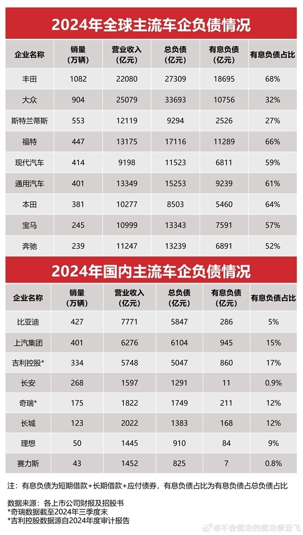 那丰田2.7万亿、大众3.4万亿、福特1.7万亿、吉利5047亿、上汽6104亿,他们危险吗?(图2:2024年上市公司财报信息—负债情况)