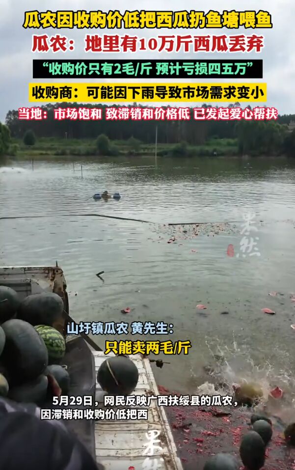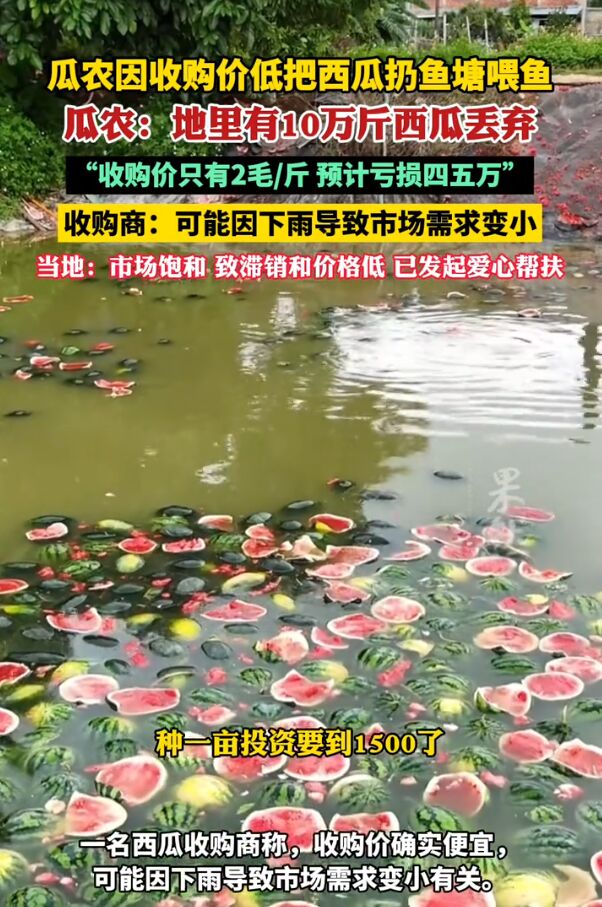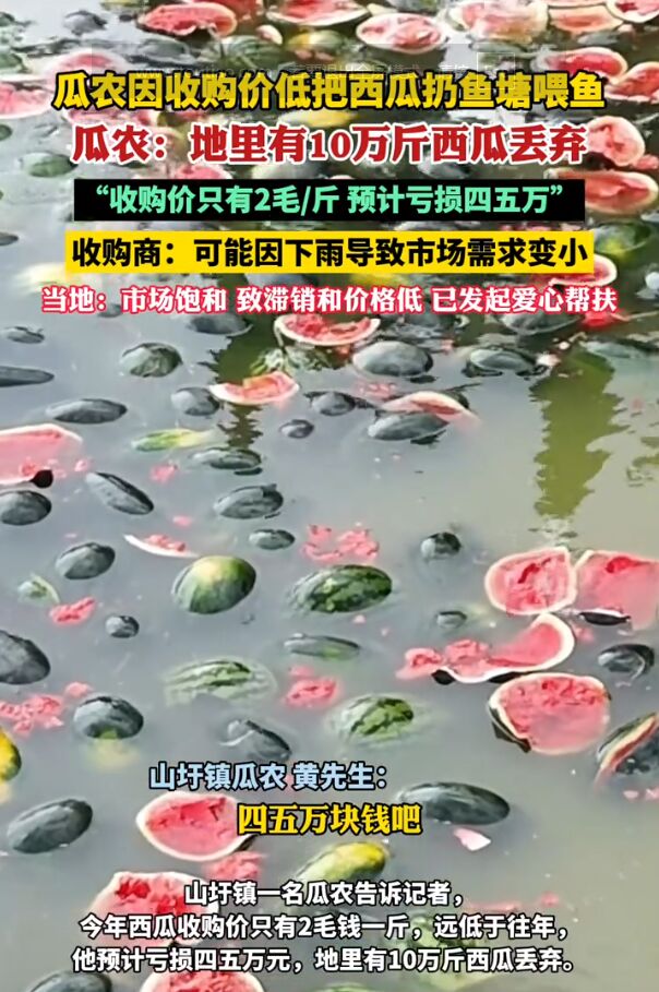 看着心疼!广西扶绥,由于西瓜收购价只有2毛钱一斤,瓜农最近日子不好过,地里的西瓜不是烂在地里,就是被扔进池塘,既然处理不掉,那就直接喂鱼算了