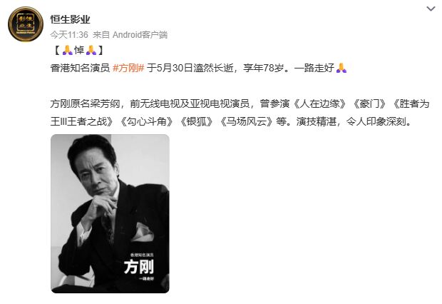 香港知名演员方刚于5月30日溘然长逝,享年78岁。方刚原名梁芳纲,前无线电视及亚视电视演员,曾参演《人在边缘》《豪门》《胜者为王lll王者之战》《勾心斗角》《银狐》《马场风云》等。演技精湛,令人印象深刻。