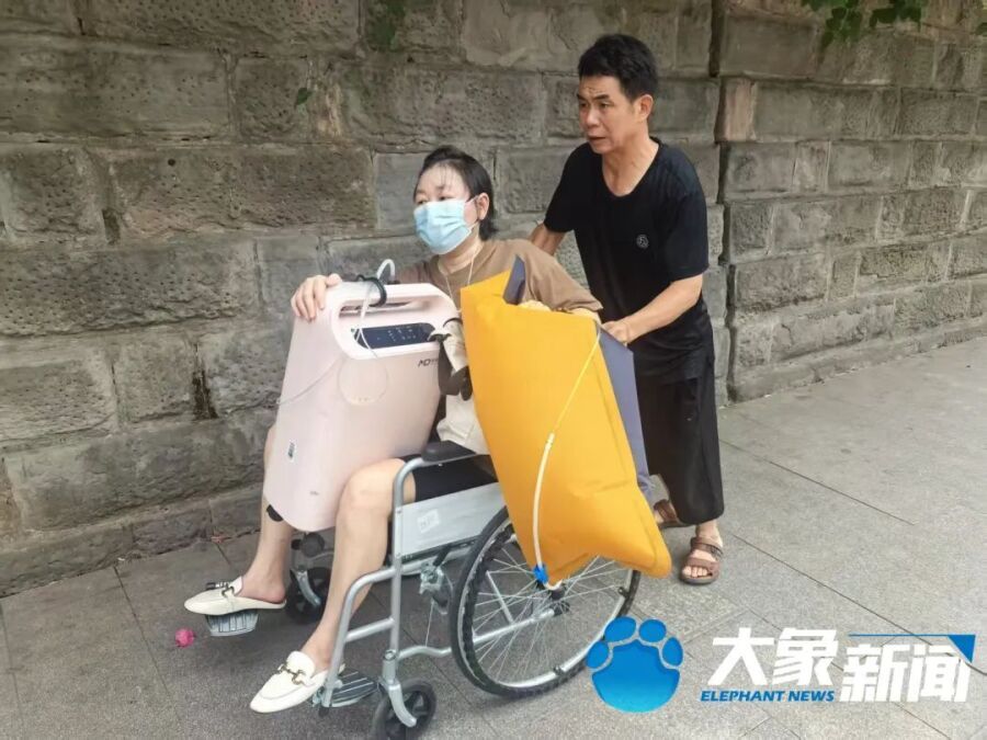 山城重庆。39度的高温天气里,刘呈富推着轮椅爬坡过坎,不多时便汗流浃背呼吸短促。坐在轮椅中的李忠美怀里抱着30多斤重的制氧机,拖着枕头状氧气袋,丝毫不比丈夫轻松。