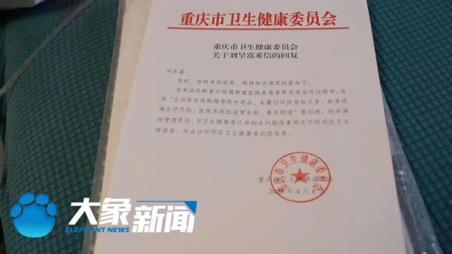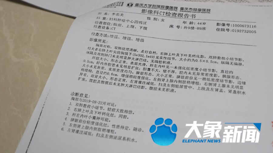 “我的宫颈癌一直都是在重庆大学附属肿瘤医院治疗的,每次治疗都有体检,我的左肾有问题,院方也是清楚的,我不知道李某为什么还不断给我推荐。”今年3月,李忠美首先向重庆大学附属肿瘤医院反映了李某的“失职问题”。