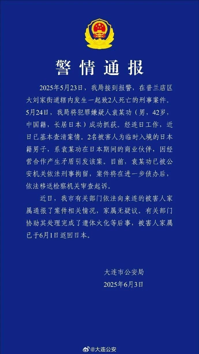 5月24日,大连公安局将犯罪嫌疑人袁某功(男,42岁,中国籍,长居日本)成功抓获。经连日工作,近日已基本查清案情。2名被害人为临时入境的日本籍男子,系袁某功在日本期间的商业伙伴,因经营合作产生矛盾引发该案。目前,袁某功已被公安机关依法刑事拘留,案件将在进一步侦办后,依法移送检察机关审查起诉。