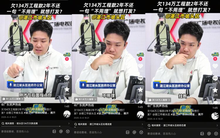 据上游新闻报道,6月6日,广东广播电视台《广东民声热线》官方账号发布了一条节目视频,视频中,电台听众袁先生向主持人投诉,称当地政府欠他134万工程款2年不还。然而,当主持人打电话到湛江市坡头区政府办公室反映这件事情时,电话那头传来嬉笑声,一工作人员指示接电话的工作人员“不用理,挂掉!”