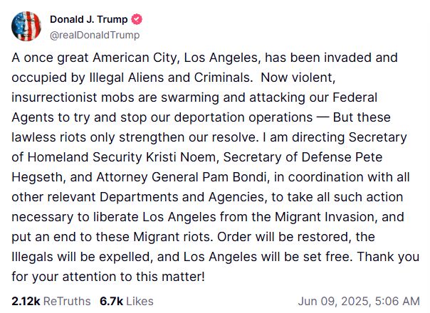 特朗普指示国土安全部长诺姆、国防部长赫格塞思和司法部长邦迪等官员,协同相关部门与机构采取一切必要行动,“将洛杉矶从移民入侵中解放出来,并结束这些移民暴乱”。