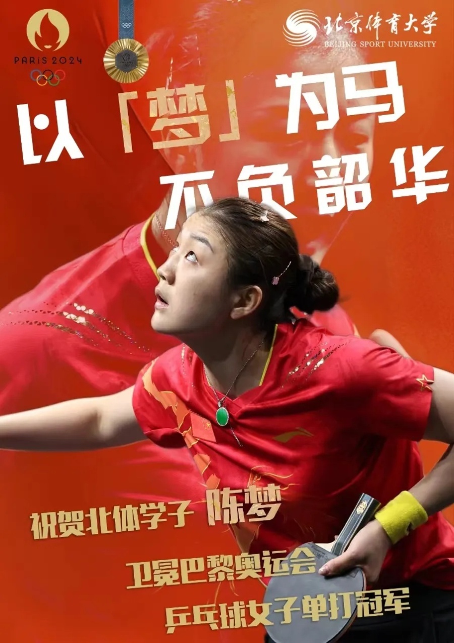 陈梦获得巴黎奥运会女单冠军时,北京体育大学曾发文为她庆祝:“巴黎奥运会乒乓球女单总决赛中,我校2017级研究生冠军班学子陈梦4-2战胜孙颖莎,获得冠军。祝贺陈梦夺冠!也祝愿陈梦能够继续在乒乓球赛场上创造辉煌!”