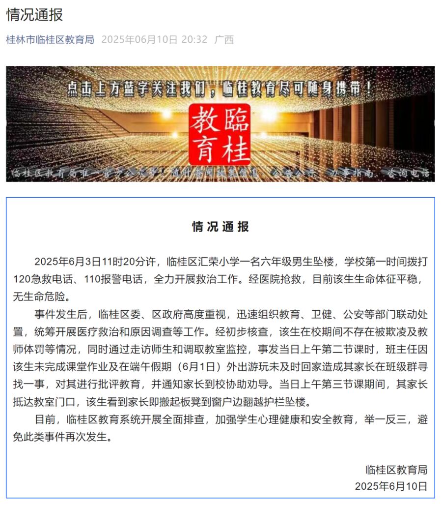 2025年6月3日11时20分许,临桂区汇荣小学一名六年级男生坠楼,学校第一时间拨打120急救电话、110报警电话,全力开展救治工作。经医院抢救,目前该生生命体征平稳,无生命危险。