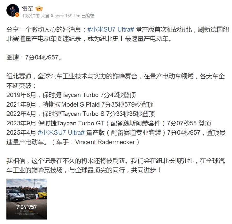 2025年4月#小米SU7 Ultra#量产版(配备赛道专业套装)7分04秒957,登顶最速量产电动车。(车手:Vincent Radermecker)