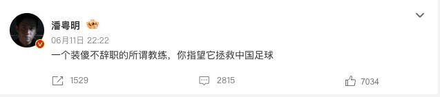 对此,演员潘粤明在微博写道:“一个装傻不辞职的所谓教练,你指望它拯救中国足球。”