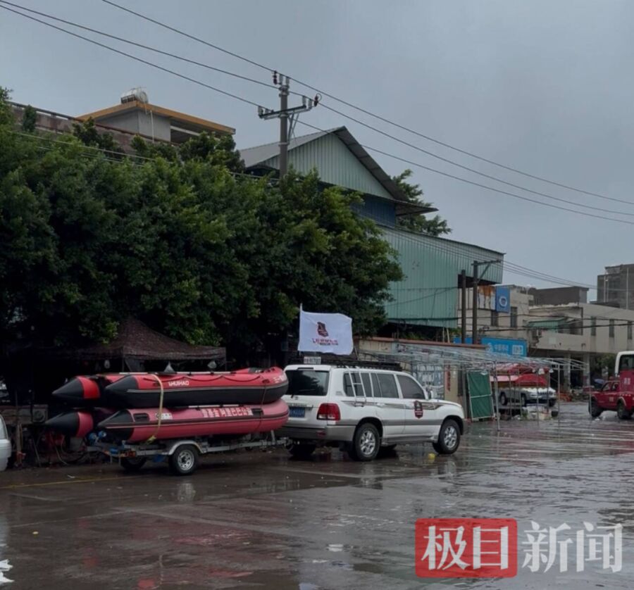 道路另一侧,消防、救援车辆正在备勤。南粤工程机械应急救援队队长陈华杰告诉极目新闻记者,他们昨天下午便率三车三艇十人到江洪镇备勤,随时准备应对突发情况。