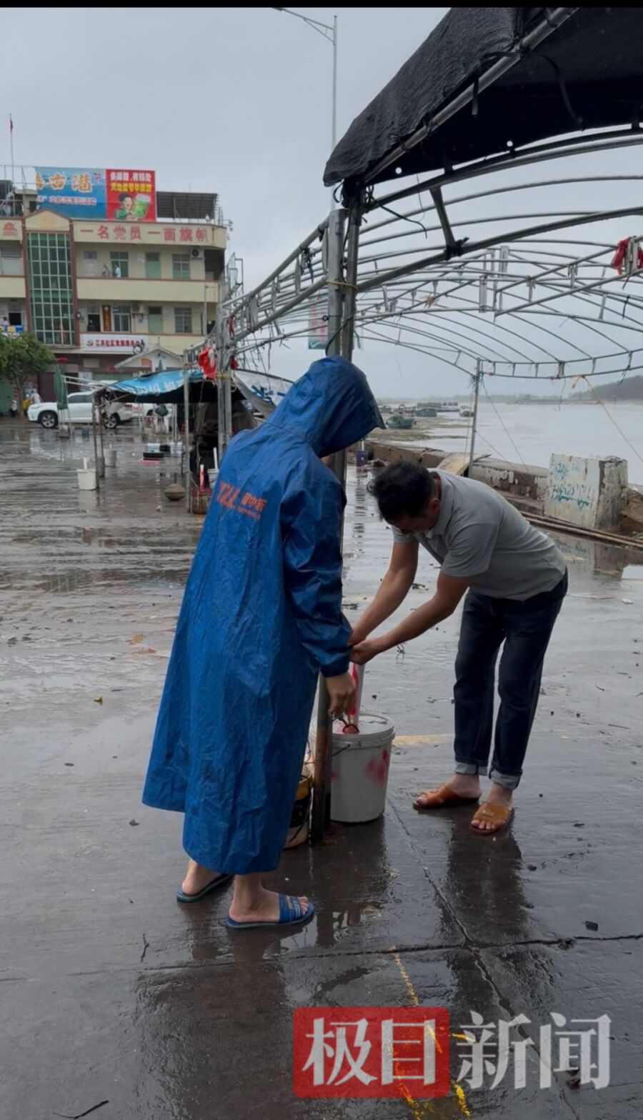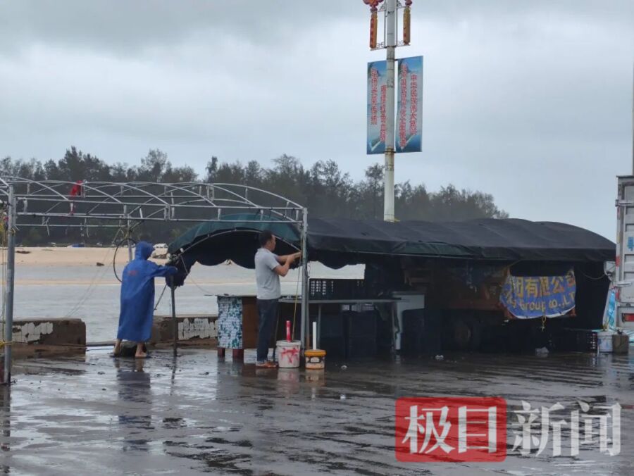 港口近海侧分布着不少渔摊,趁风雨还没增大,不少摊贩从家中赶来,穿着雨衣降低顶棚,盖上防水布进行加固,抵御台风冲击。