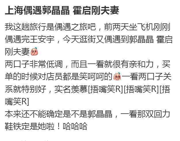 6月14日,有网友发文,称在上海西岸梦中心遇到了郭晶晶夫妇。当天下着小雨,霍启刚陪着郭晶晶一起逛街,身边不被孩子包围的俩人终于有机会享受一下二人世界了。