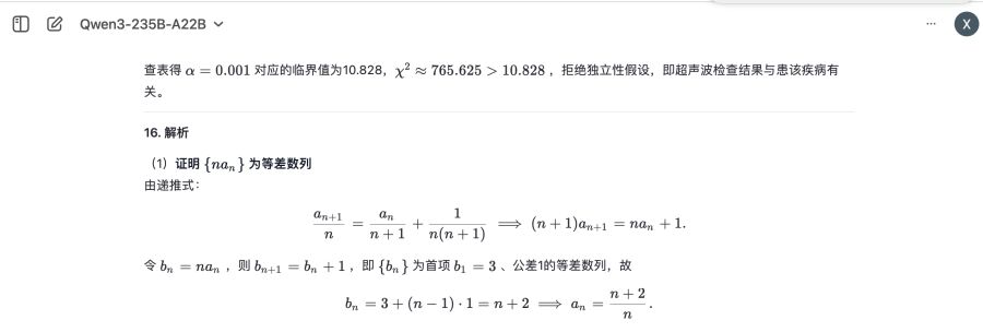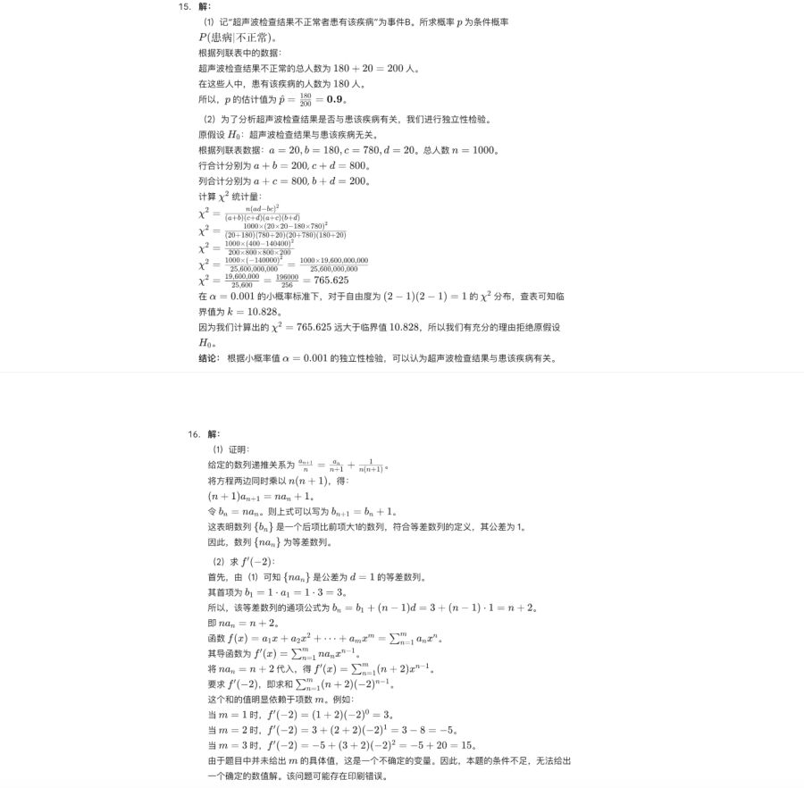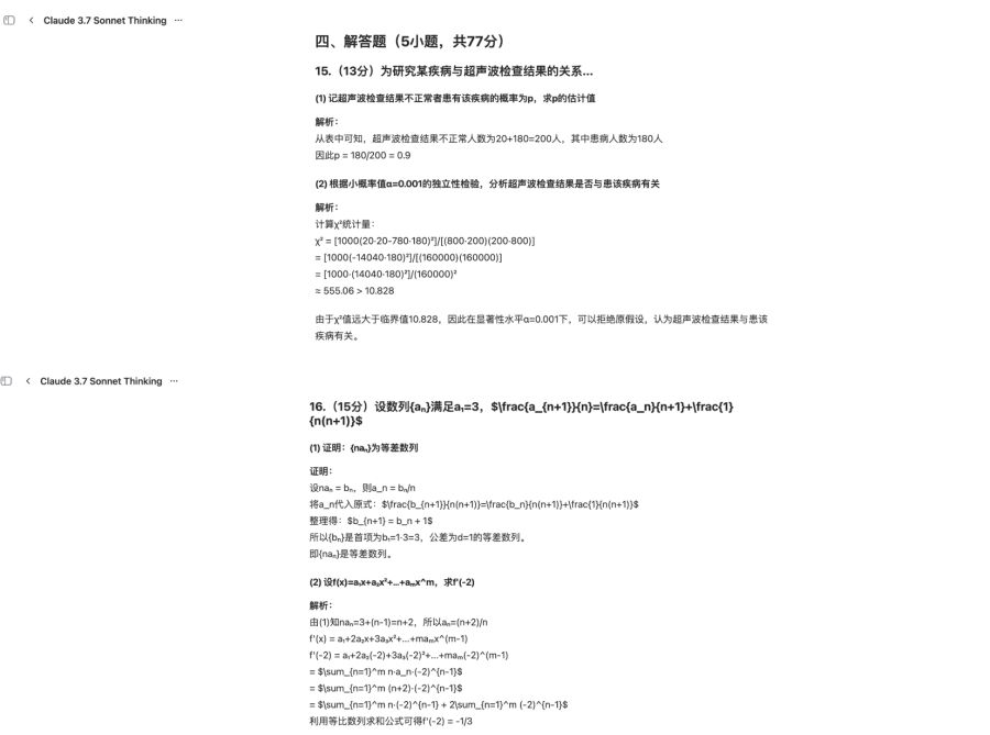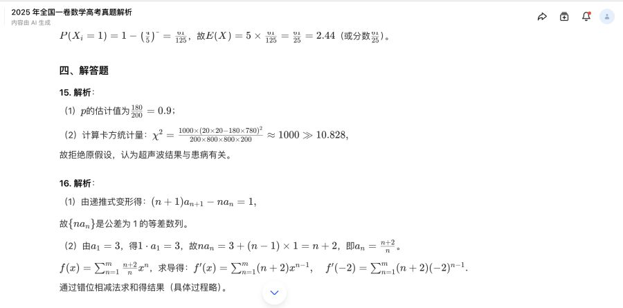 7.数列大题,因为标准格式还有一些检验、验证等说明细节,部分AI这部分给的比较简略。求和的部分,Google Gemini模仿人算到半截算不下去了。也有的用的格式非常高级,不太符合高中生日常的书写;也有的草草给了个建议,并未给过程和结果。