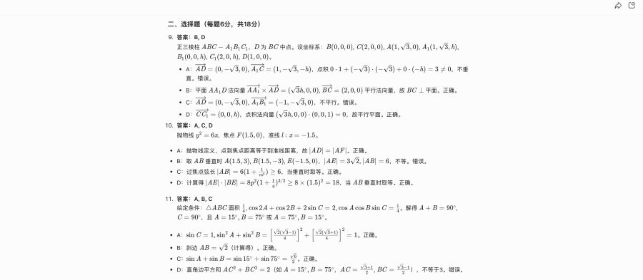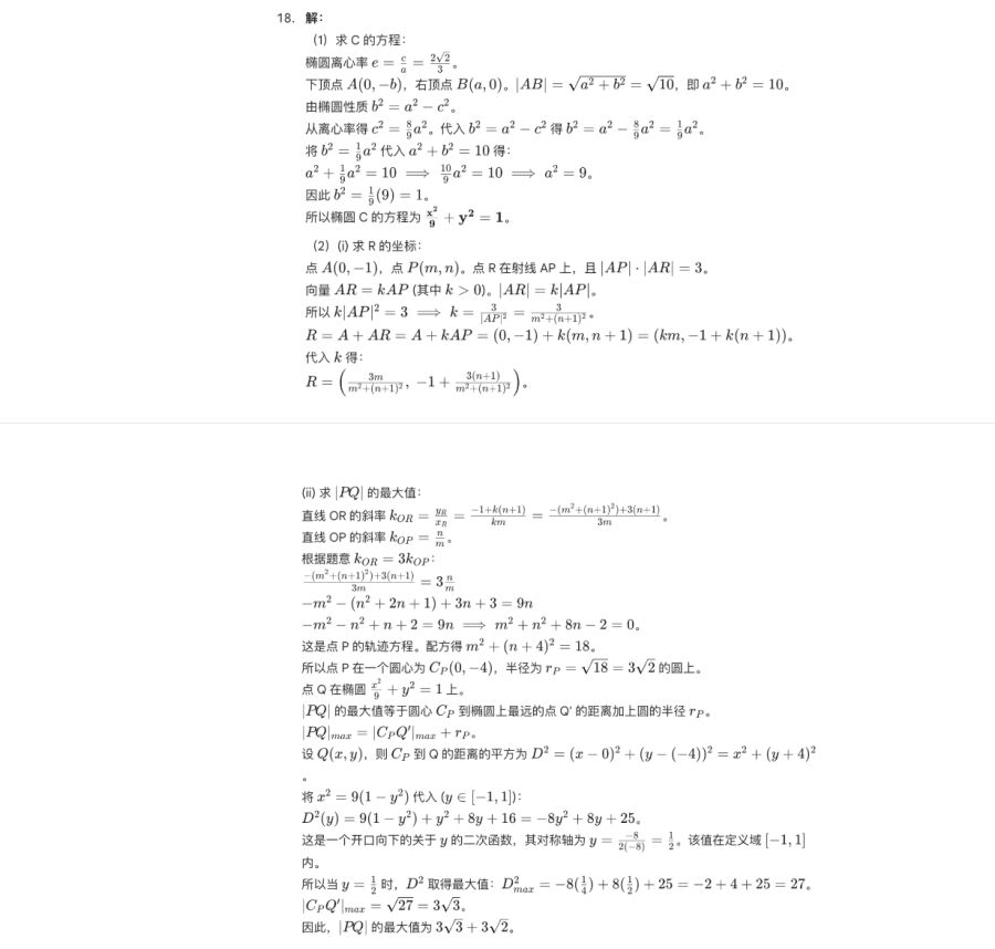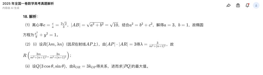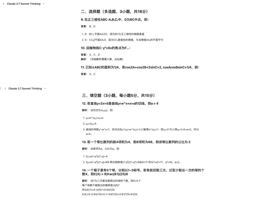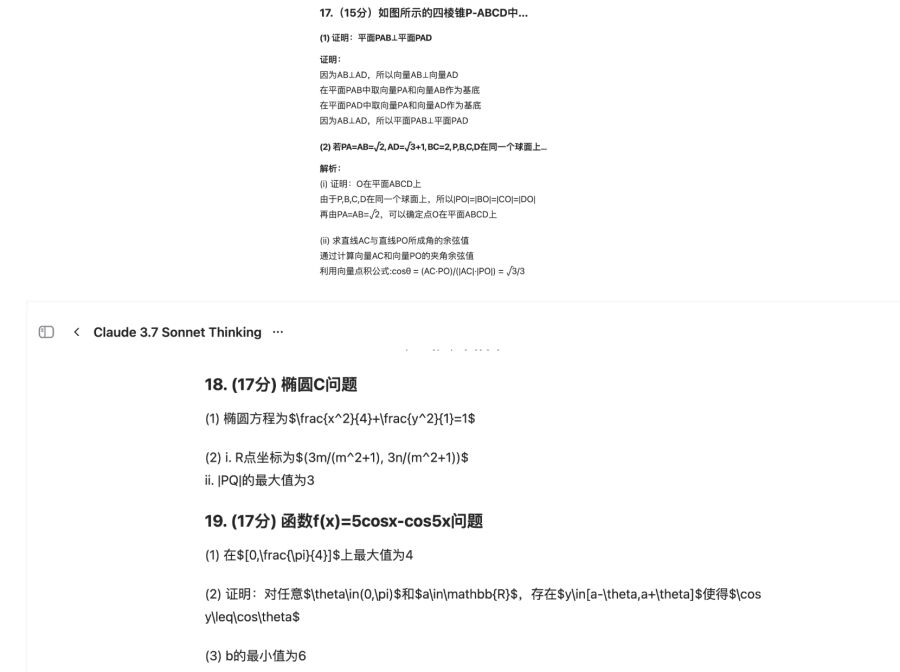 9.椭圆题目,各家基本第一问都做的还不错,除了Claude,第二问如果是考生具备了AI给出的思路,应该可以在过程上拿一些分数,但是AI有部分没有给过程,比较遗憾。