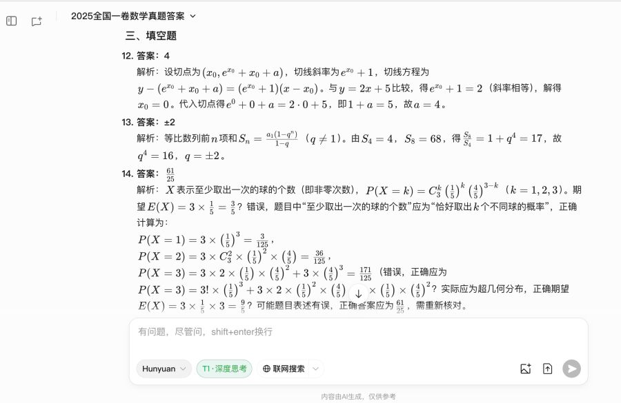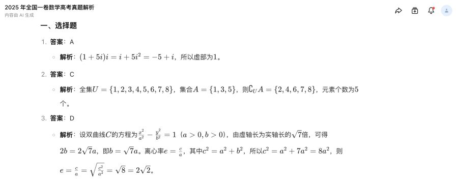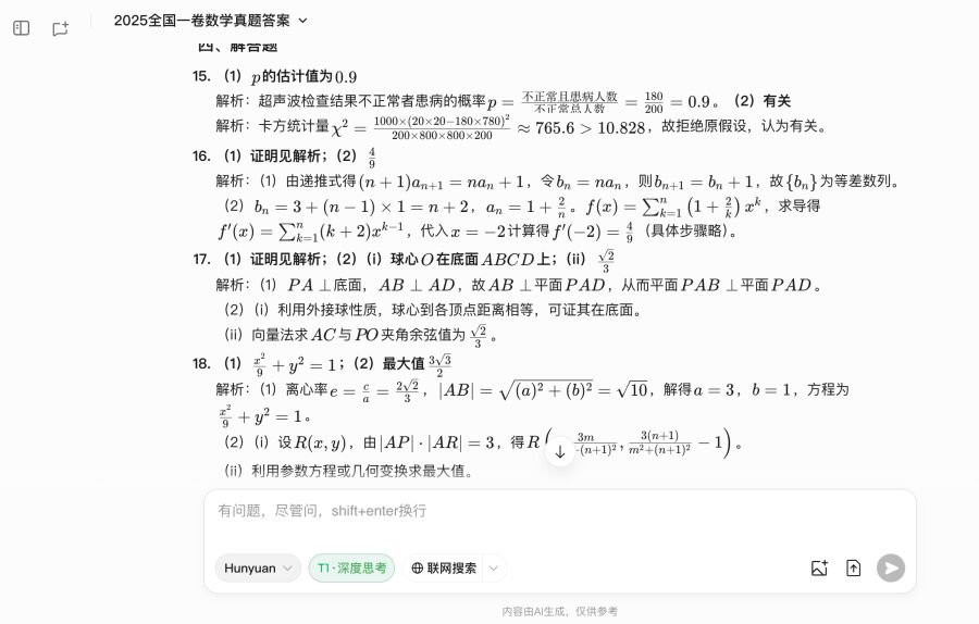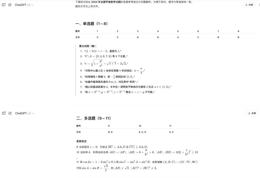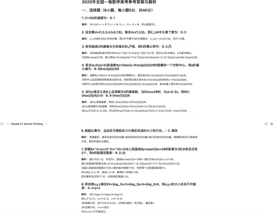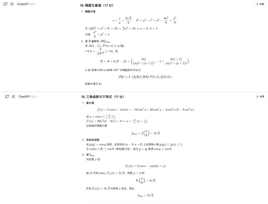 这一方面得益于通用AI大模型的进步,另一方面也不排除今年的高考题目相对“简单”,笔者认为新高考在调整成19道题的卷面后,缺少高难度的创新题,数学、椭圆、导数,内部虽然有创新,但是考生如果平时接受比较良好的数学指导,可以通过过程拿到多半的分数,最终高考成绩也不会太低。正是这样一份相对答案比较套路的试卷,比较符合AI利用模型解题,从题库里面找类似的进行完善。没有很好的考查到AI面对创新题目,能否有效结合题目条件给出作答。