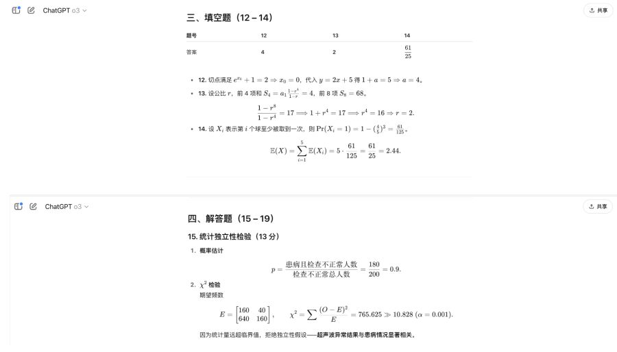 6.出乎笔者意料的,概率统计大题,所有的AI都很好地完成了,应该是与现实世界中,报表比较多,处理数据的方式,有的AI直接用了统计学上的一些方法。