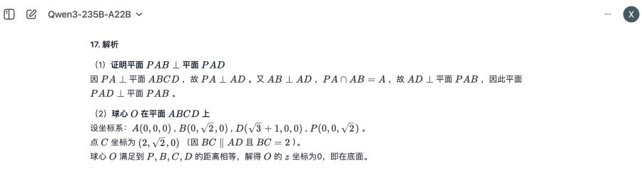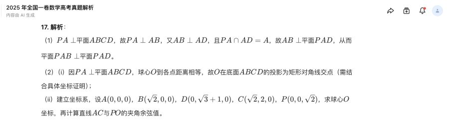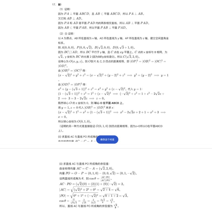 8.立体几何第一问,各家都可以严格按照定理来推理,好评。但是第二问的证明,各家差距明显。不论是计算坐标法,还是几何方法,AI们各显神通。第三问其实回到电脑擅长的计算领域,如果没得分真的就是“活该”了。