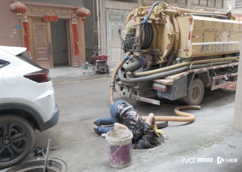 “哐”,井盖掀开后落地发出一声闷响,随后一股地下管道特有的湿臭气味扑面而来。锋哥面不改色地凑上前去查看管道淤积的情况,他早已对这些难闻的气味免疫了。“你看看,全都堵住啦!”他指着管道对远远探身查看的客户说道。