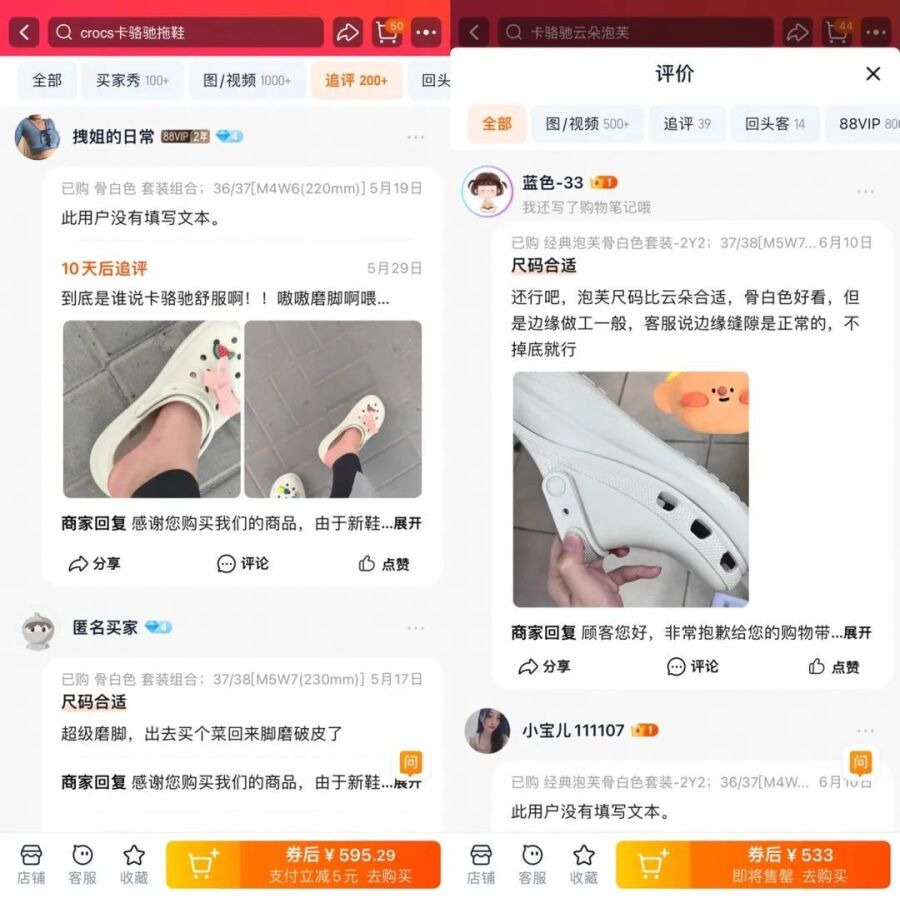 除了饱受诟病的价格波动问题,Crocs的产品体验同样槽点满满,从磨脚、笨重等舒适度缺陷,到做工粗糙、两只脚不一样等基础质量问题,都成为消费者吐槽的重灾区。