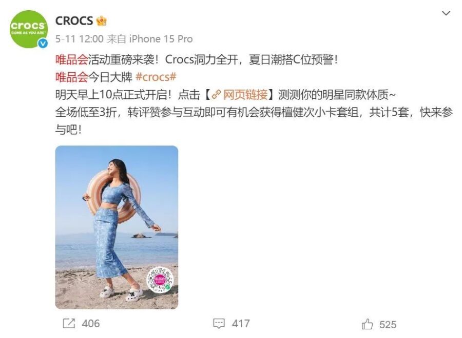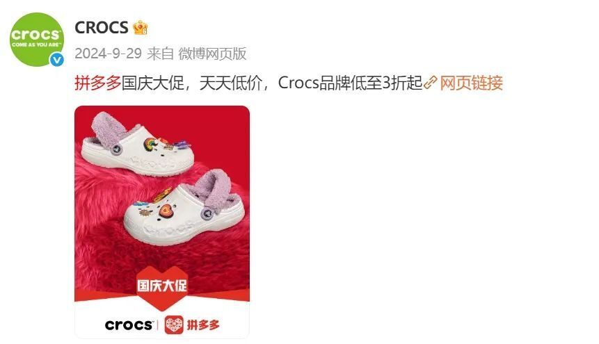 而如今,Crocs的打折促销已成为常态。翻看其官方微博可以发现,近两年来几乎每个购物节点都能看到品牌促销的身影,从天猫到抖音,从拼多多到唯品会,各大电商平台无一缺席。