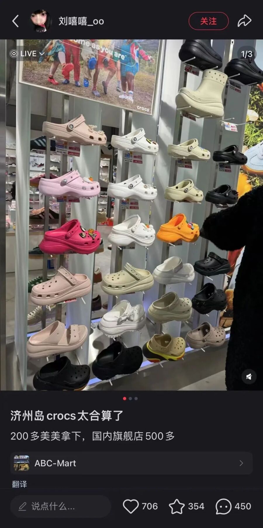 因嫌官方渠道定价过高,不少消费者转战海淘。近几年韩元贬值,Crocs甚至被买成了“韩国土特产”。在小红书,“首尔/济州岛买Crocs”相关笔记有8万+篇,在国内卖500多元的厚底洞洞鞋,韩国专柜只要200元出头。