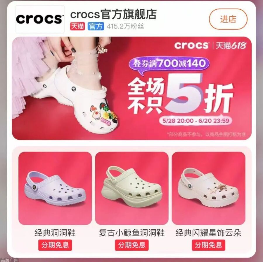 今年“618”期间,打开天猫crocs官方旗舰店,“全场不止5折”的促销海报铺天盖地。