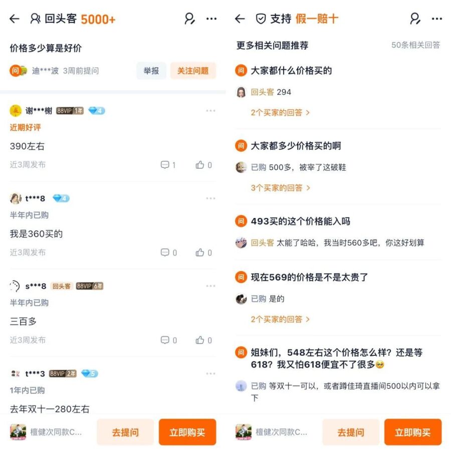 在天猫crocs官方旗舰店商品提问区, “多少算是好价”成为最热门提问之一。而300—500元不等的回答,折射出消费者对产品价值认知的混乱。