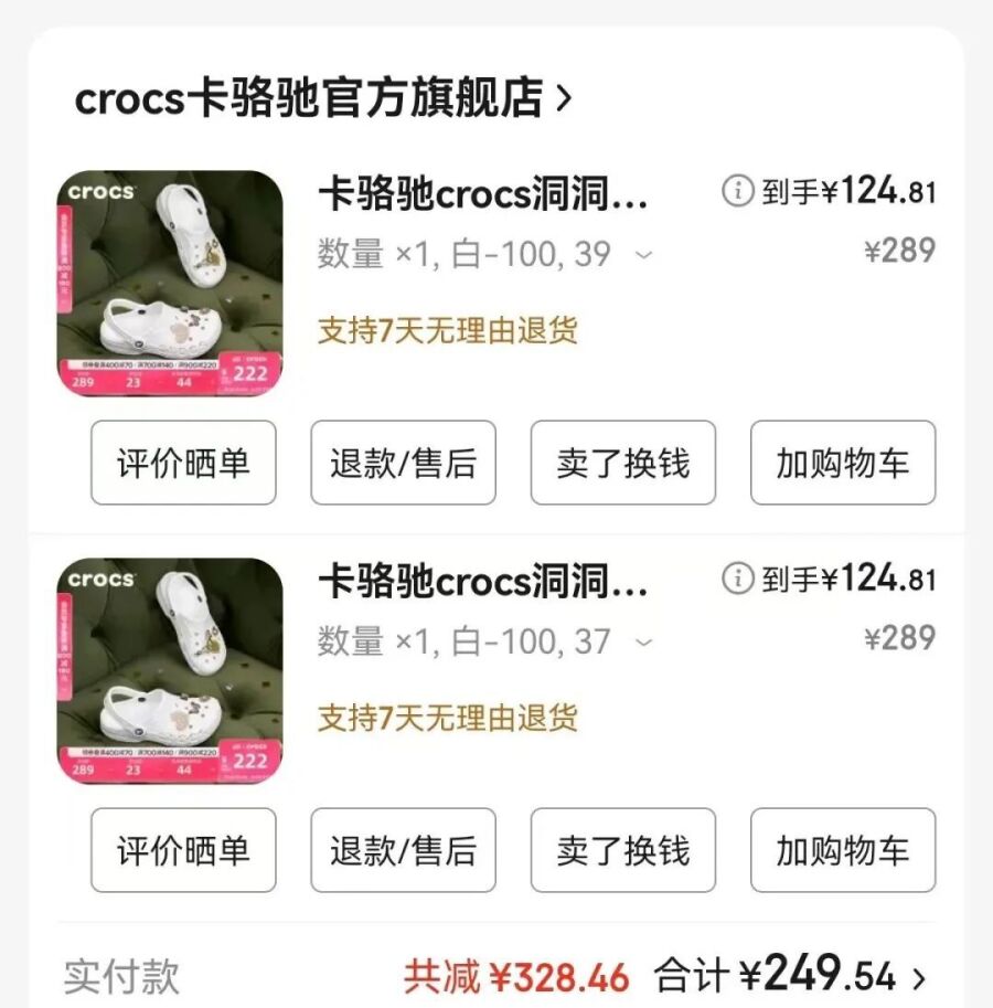 从“泡芙” “云朵”到“光轮”系列,Crocs的明星产品都出现了不同幅度的折扣。以热销款“泡芙”为例,官方标价739元,立减后599元,约打8折。而在李佳琦直播间,叠加平台优惠后,有消费者晒出359元的到手价,价格近乎腰斩。