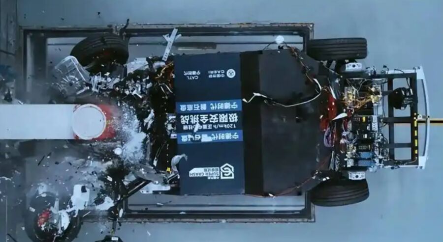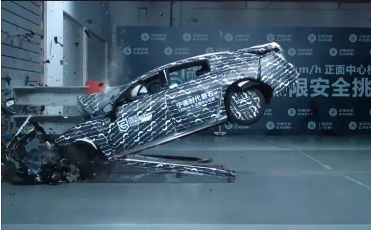 于是,宁德时代先是拿基于磐石底盘打造的样车,做了一次120km/h的正面中心柱碰的极限安全挑战,模拟超高速情况下车辆失控撞上电线杆的极端场景。