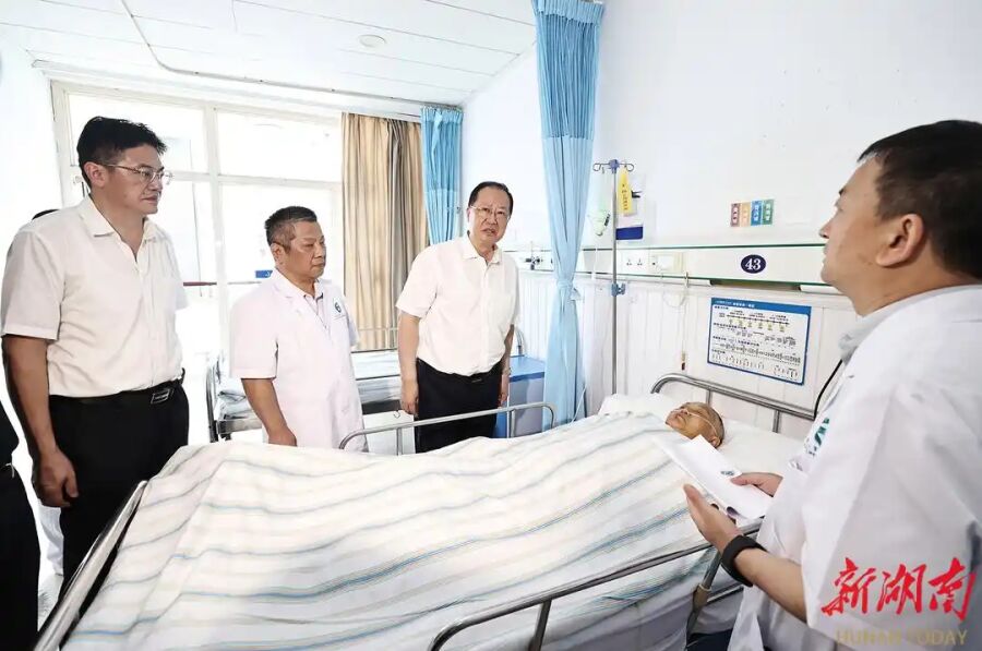 在常德市第一人民医院,毛伟明走进病房看望伤员,叮嘱他们安心养病,要求把全力抢救伤员生命安全放在首位,统筹调度好省市医疗资源,“一人一方案”开展针对性救治,争取受伤人员早日康复。