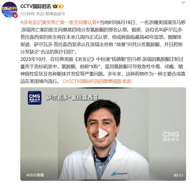 据CCTV国际时讯消息,当地时间6月16日,一名涉嫌美国演员马修·派瑞死亡案的医生同意就四项分发氯胺酮的罪名认罪。据悉,这位名叫萨尔瓦多·普拉森西亚的医生将在未来几周内正式认罪,他或将面临最高40年监禁。