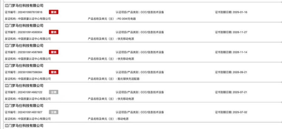 6月20日,红星新闻记者从国家市场监管总局的全国认证认可信息公共服务平台查询发现,罗马仕科技相关公司的快充移动电源3C认证被大批暂停注销,剩余3C认证多与充电器、电源适配器相关。