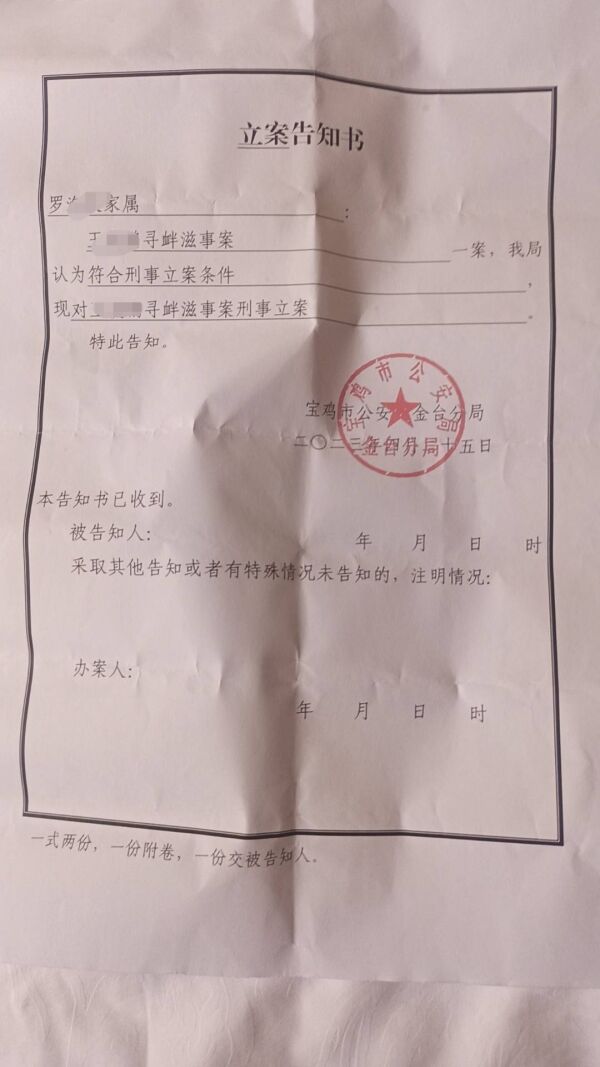 罗明提供了一份宝鸡市公安局金台分局4月25日出具的《立案告知书》,上载显示:王某鹏寻衅滋事案符合刑事立案条件,现对该案刑事立案。