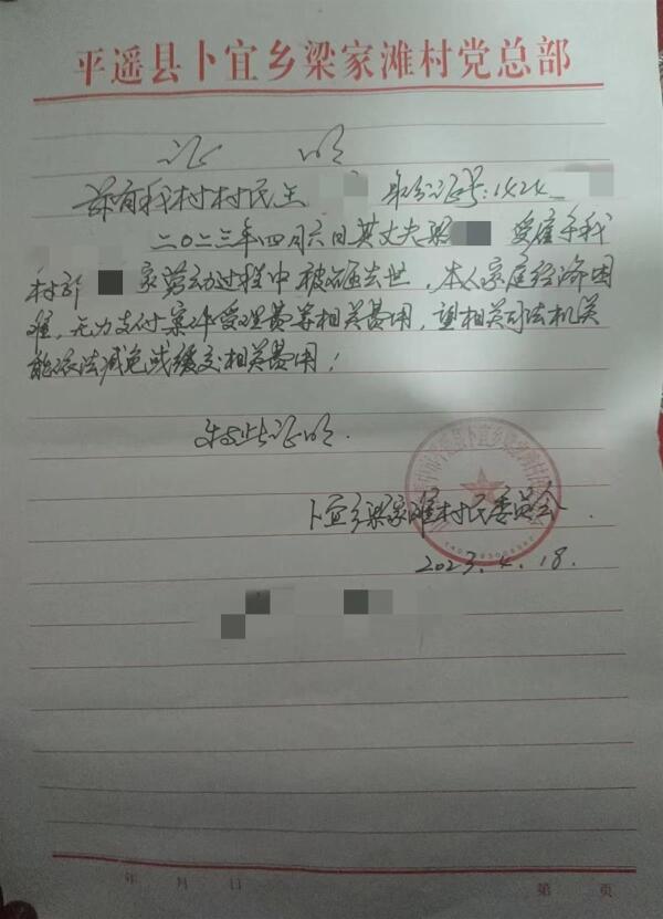 梁丽向记者提供的一份文件显示,4月18日,村委会曾为其母亲出具证明:“2023年4月6日,其丈夫梁某受雇于我村郭某家劳动过程中被砸去世,本人家庭经济困难,无力支付案件受理费等相关费用,望相关司法机关能依法减免或缓交相关费用。”