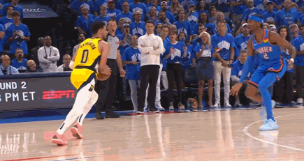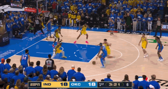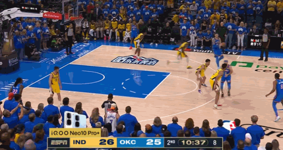 次节,马瑟林三分命中,西亚卡姆、布拉德利罚球得分,卡鲁索扣篮得分,哈滕篮下命中。内史密斯三分命中,亚历山大连得4分,华莱士三分命中,雷霆领先5分。麦康奈尔、内姆布哈德连续冲击得分。多尔特三分也中,特纳、麦康奈尔中投得分,双方战成40平。亚历山大上篮得分,马瑟林三分命中,西亚卡姆两罚全中。哈滕完成2+1,亚历山大两罚两中。内姆布哈德三分命中,半场结束,步行者48-47领先雷霆。