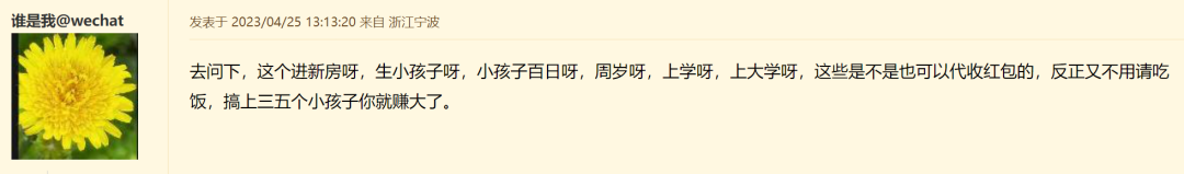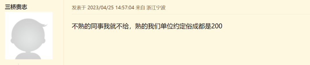 在公司里礼尚往来,其实随份子钱是一个很常见的现象,一个人在公司里的人际关系好坏有时候都会通过份子钱来衡量。但对于刚入职不久的新人来说,这份随礼其实有点过于“厚重”。痞老板的这一帖子,也引起了网友的共鸣,东论网友“愿世间永安”也爆料称自己之前也遇到过这类事: