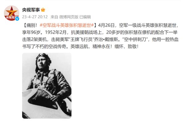 4月27日,据央视军事:4月26日,空军一级战斗英雄张积慧逝世,享年96岁。1952年,抗美援朝战场上,20多岁的张积慧在僚机的配合下一举击落2架美机,击毙美军“王牌飞行员”乔治•戴维斯。“空中拼刺刀”,他用一腔热血书写了不朽的空战传奇。英雄远航,精神永在!缅怀,致敬!