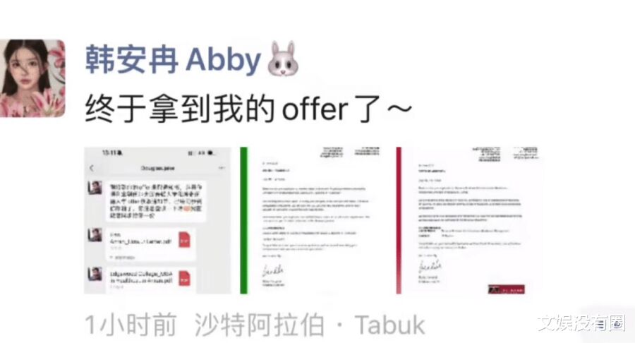6 月 25 日,韩安冉在社交平台高调晒出两份硕士offer,称“这是 14 岁辍学以来的一次圆梦”,并表示未来将通过线上授课形式完成学业,继续深耕她从事多年的医美行业。