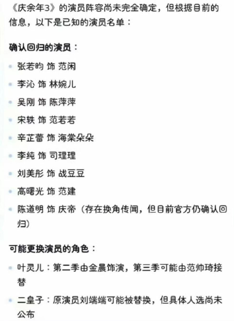 6月25日,针对网上热议的《庆余年3》选择和换角的讨论,有媒体向片方进行了求证,片方回应称目前第三季还在剧本创作阶段,尚未开启选角工作,请大家以官宣为主,并强调“勿信谣传谣”。