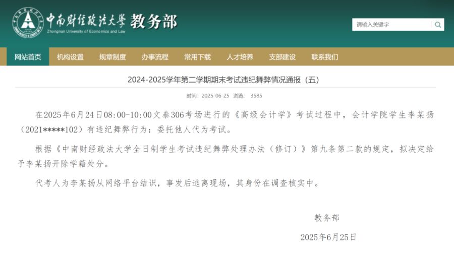 此前,6月24日,有网友在社交平台上发帖称,湖北武汉中南财经政法大学某场考试中一男子着女装替考,引发网友热议。