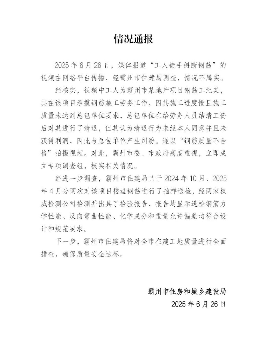 2025年6月26日,媒体报道“工人徒手掰断钢筋”的视频在网络平台传播,经霸州市住建局调查,情况不属实。