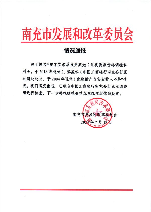 新京报讯 7月19日,南充市发改委发布情况通报。详情如下: