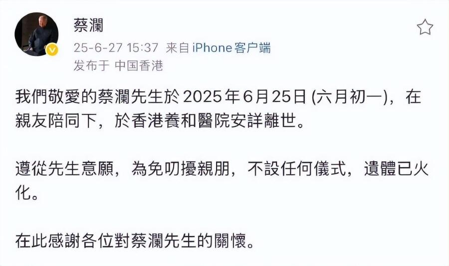 6月25日,蔡澜先生离世。