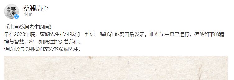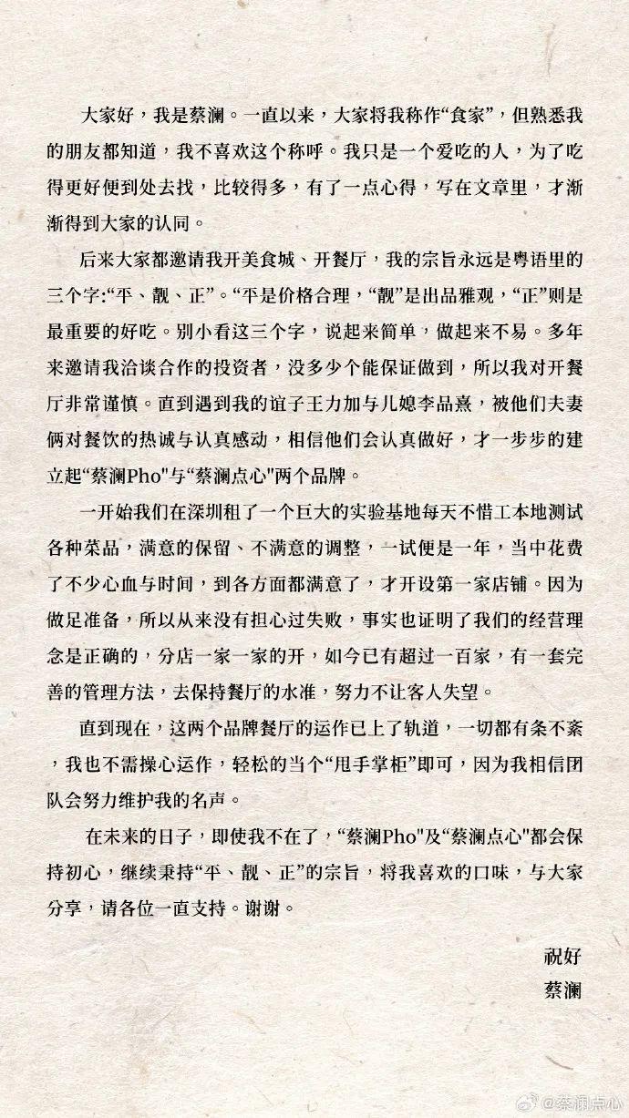 27日下午@蔡澜点心 发文,公布一封蔡澜先生的信: